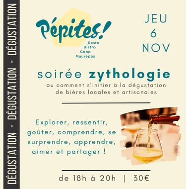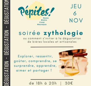 Le 06 novembre nos amies de Pépites! vous convient à une soirée zythologie. Retrouvons nous au bistrot de Maurepas pour un voyage dans les mondes de la bière convivial et gourmand